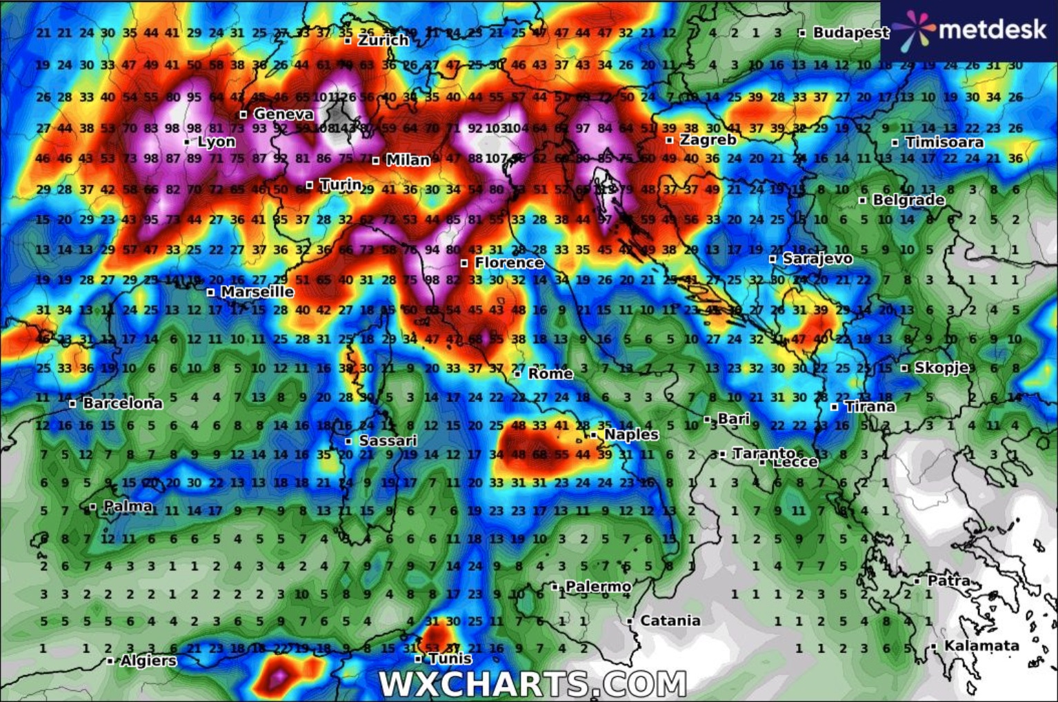 Il vortice depressionario che si verrà a creare attirerà masse d’aria più miti dal quadrante meridionale. In particolare, venti da sud e sud-ovest, dopo aver attraversato il Bacino del Mediterraneo, si arricchiranno di umidità, facendola scaricare brutalmente su molte regioni italiane.
