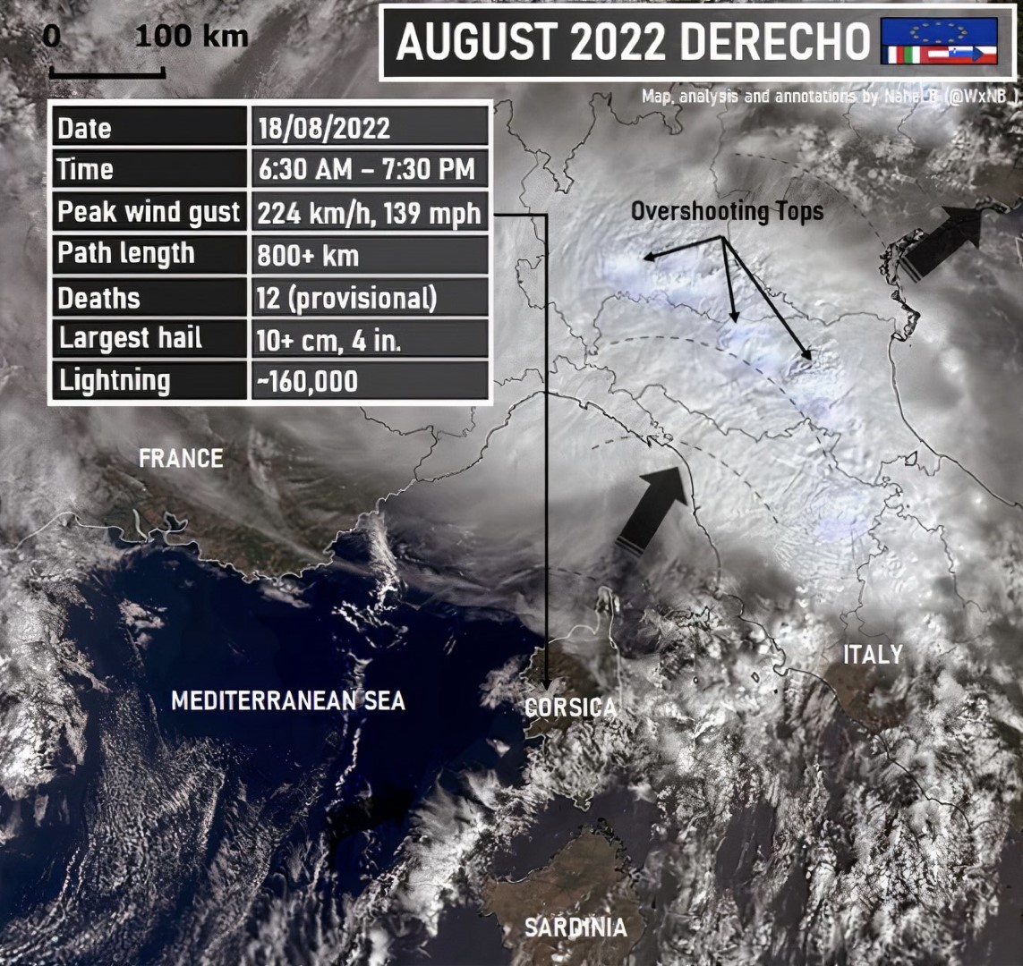 Il Dereho è un sistema temporalesco lineare che può coprire ampie aree, generando venti molto forti e fenomeni intensi. Si sviluppa con nubi a imponente sviluppo verticale e può causare danni diffusi. La possibilità che un evento simile si verifichi la prossima settimana non può essere esclusa, anche se le previsioni odierne non permettono di confermarlo.