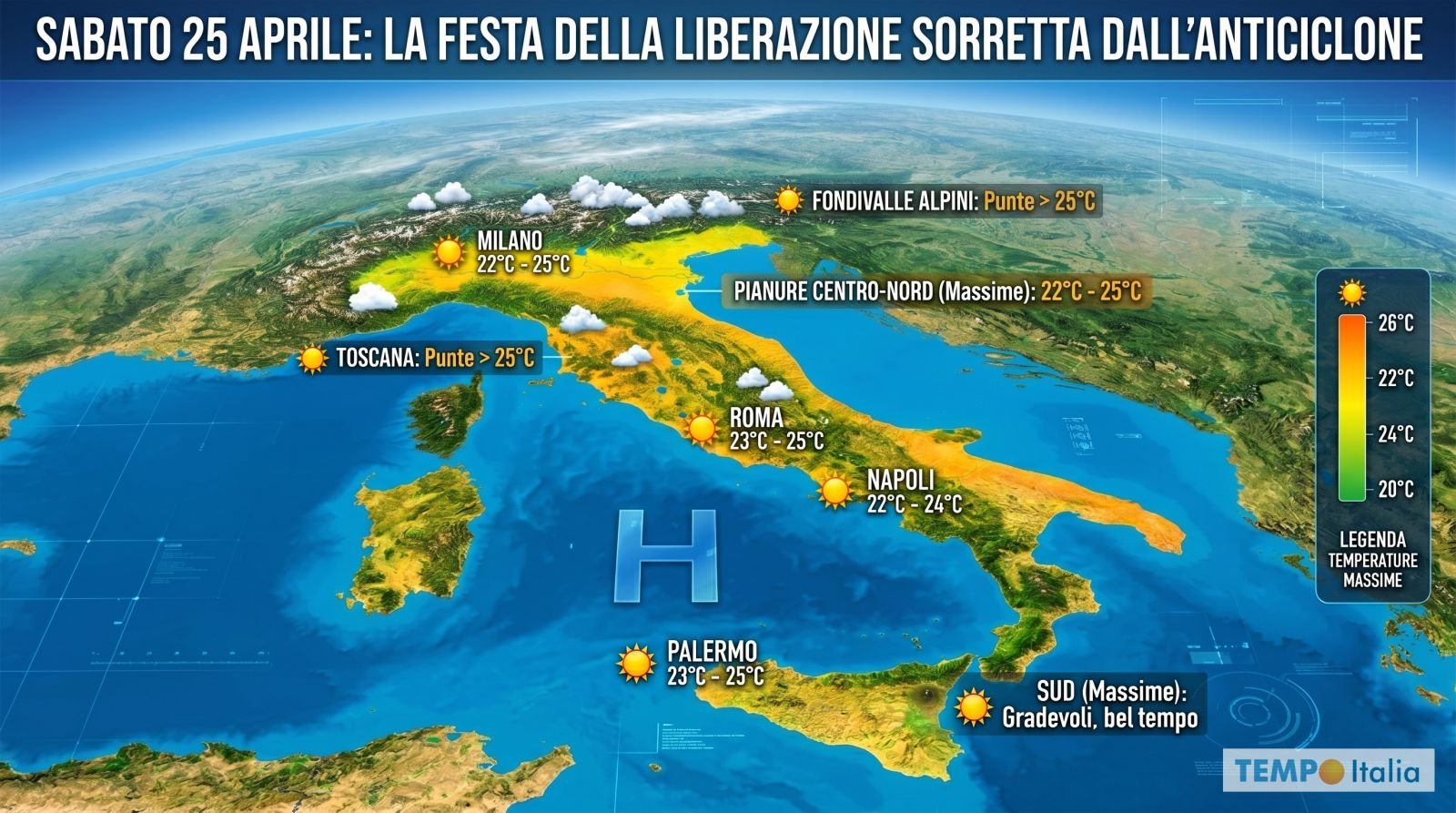La giornata del 25 Aprile si profila con cieli in prevalenza sereni o poco nuvolosi su tutta la penisola. Qualche velatura alta potrà transitare senza conseguenze pratiche, mentre sui rilievi alpini e appenninici potranno svilupparsi nel pomeriggio innocui cumuli senza precipitazioni degne di nota. Per Milano, Roma, Napoli e gran parte delle aree pianeggianti le condizioni saranno decisamente favorevoli a una giornata all’aperto.