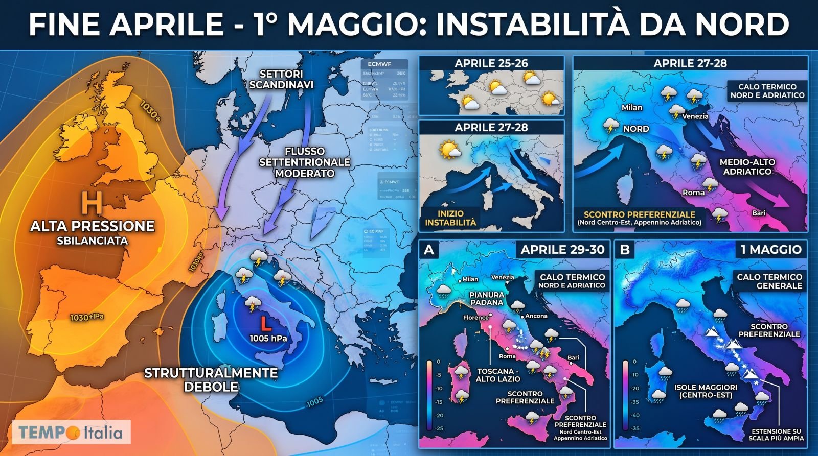 La novità più rilevante riguarda ciò che accade oltre il ponte del 25 Aprile. Le proiezioni ECMWF mostrano un’alta pressione che, dopo la rimonta, si posizionerà con i massimi sbilanciati verso ovest, risultando strutturalmente debole sul Mediterraneo centrale. Sul bordo orientale di questa struttura, correnti settentrionali moderate potrebbero scivolare dai settori scandinavi verso il Mediterraneo, riportando instabilità a partire dal 27 Aprile sul Nord e sul medio-alto Adriatico, per poi estendersi progressivamente a buona parte del Paese nei giorni seguenti.