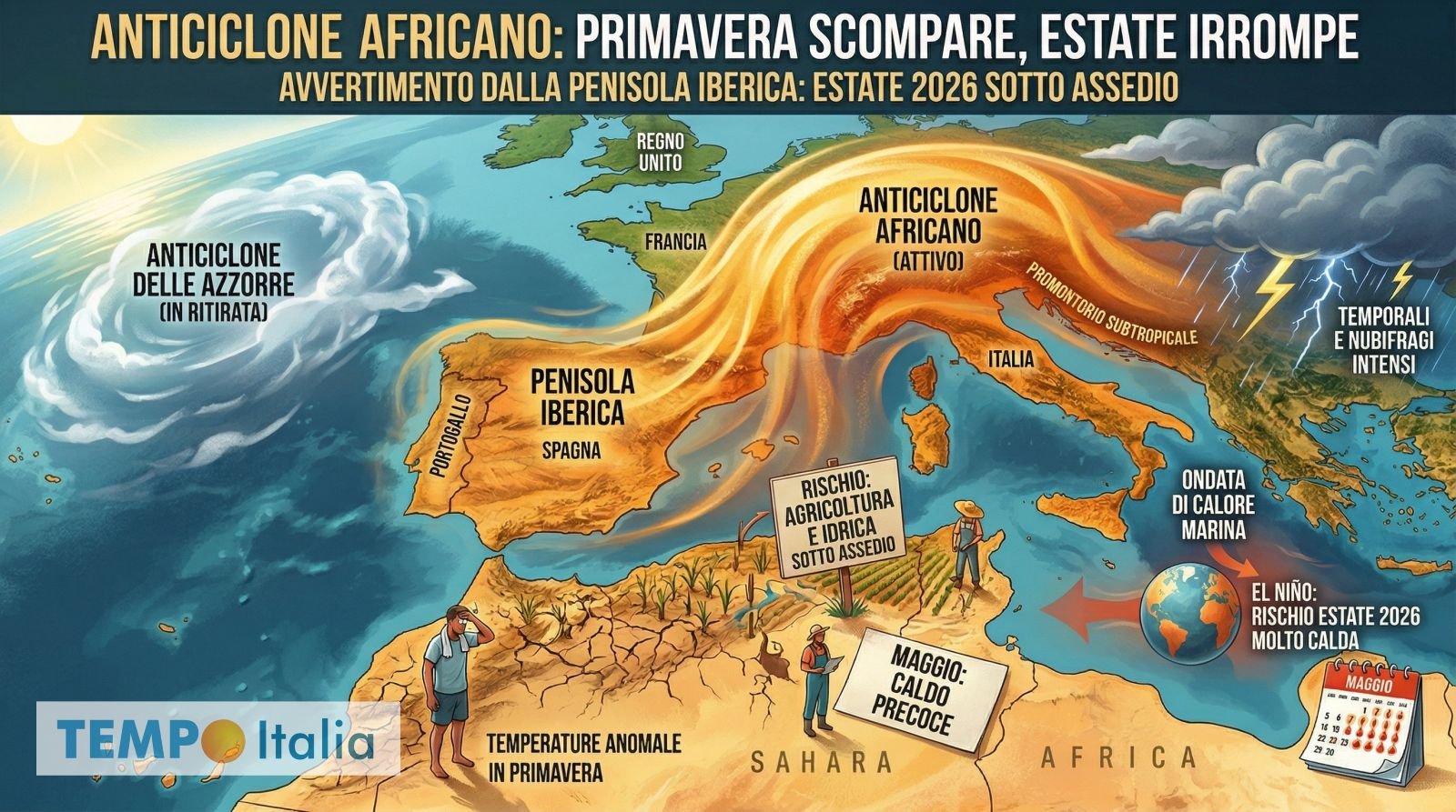 Anche un promontorio anticiclonico di entità moderata, qualora dovesse avvicinarsi alle regioni italiane, avrebbe comunque la capacità di far schizzare le temperature verso valori anomali per il periodo. E qui si entra nel capitolo forse più delicato dell’analisi: maggio come possibile mese di svolta. Il quinto mese dell’anno è storicamente uno dei più imprevedibili del calendario meteorologico, capace di passare senza preavviso da giornate gradevoli a ondate di caldo precoci e fastidiose. Se l’Anticiclone Africano dovesse trovare la finestra giusta per imporsi già in quella fase, le conseguenze si farebbero sentire in modo deciso.